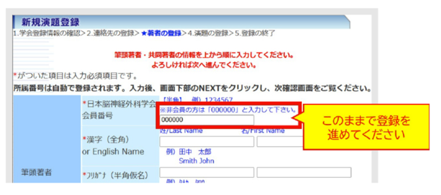 日本脳神経外科学会会員番号を持たない先生:000000 と登録ください。