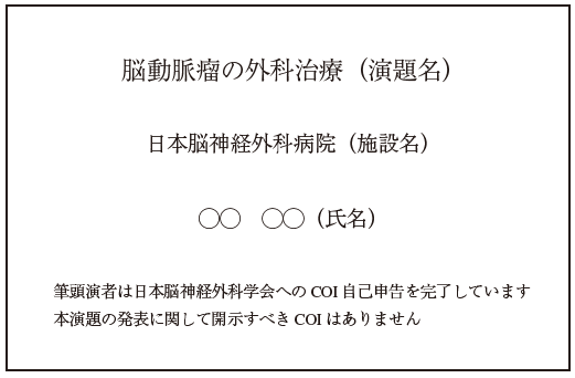 演題を発表するにあたって、筆頭演者は事前に日本脳神経外科学会に対してCOI(利益相反)自己登録を完了しておいてください。COI(利益相反) 自己登録は(一社)日本脳神経外科学会ホームページ(https://jns-official.jp/)の会 員専用ページからお手続きいただきます。